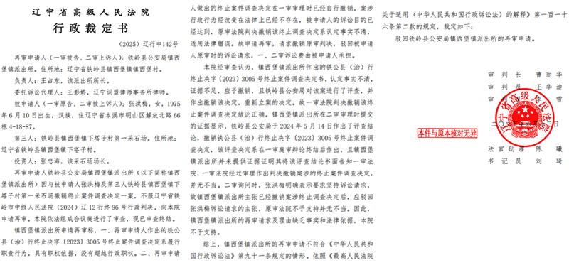 镇西堡派出所不服一审判决提起上诉。2024年9月20日,辽宁省铁岭市中级法院以(2024)辽12行终96号判决书维持原判,指出派出所的上诉请求及理由无事实和法律依据。即便如此,派出所仍坚持申诉,2025年6月13日,辽宁省高级法院作出(2025)辽行申142号判决,再次确认一审裁判正确,驳回其再审申请。