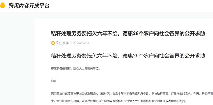 秸秆处理劳务费拖欠六年不给,德惠26个农户向社会各界的公开求助