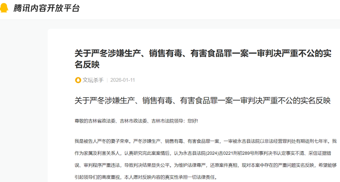 我是被告人严冬的妻子荣幸。严冬涉嫌生产、销售有毒、有害食品罪一案,一审被永吉县法院以非法经营罪判处有期徒刑七年半。我作为家属及利害关系人,认真研究完此案案情后,认为永吉县法院(2024)吉0221刑初289号刑事判决书认定事实不清、采信证据错误、审判程序严重违法,导致判决结果显失公平。为维护法律尊严,还原案件真相,现对本案中存在的严重问题实名反映,希望能够引起领导们的高度重视,本人愿对反映内容的真实性承担一切法律责任。