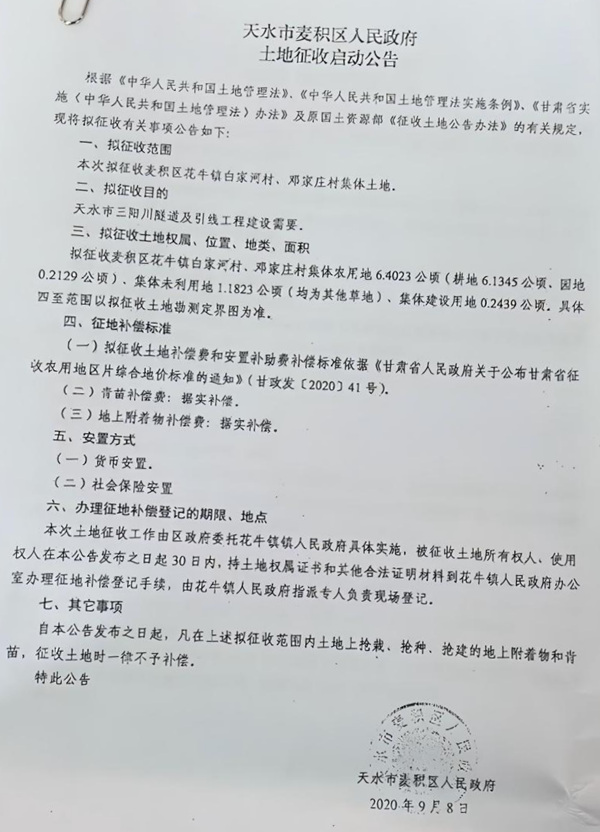 再看征地时间线。该项目“征收土地预公告”《天水市麦积区人民政府土地征收启动公告》发布于2020年9月8日,“征地补偿安置方案公告”《天水市麦积区人民政府征地补偿安置方案公告》同日发布,“征收土地公告”《天水市麦积区人民政府土地征收公告》发布于2023年5月25日。也就是说,在“征地补偿安置方案”未公告之前,该项目已经完成了土地征收,并开工建设了近1年时间,而在“征收土地公告”发布之前,该项目已经建成并投入使用。