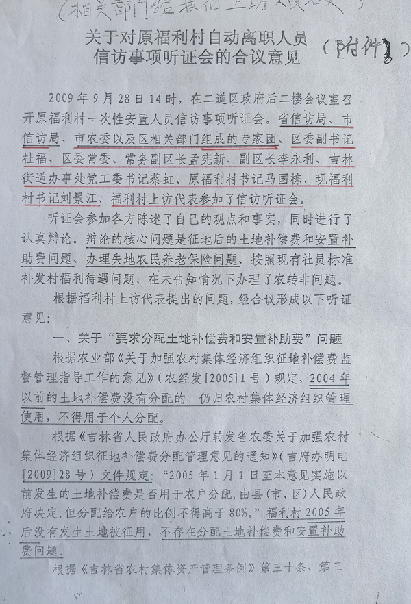 2009年9月28日14时,二道区政府在后二楼会议室召开了原福利村一次性安置人员信访事项听证会。省信访局、市信访局、市农委以及区相关部门组成专家团,还有区委、街道办事处、福利村的有关人员都参加了听证会,福利村的上访代表也在听证会现场。